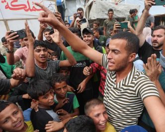 Warga Gaza merayakan pengumuman gencatan senjata tahap pertama, pada Kamis, 9 Oktober 2025. Foto: Reuters/Ramadan Abed
