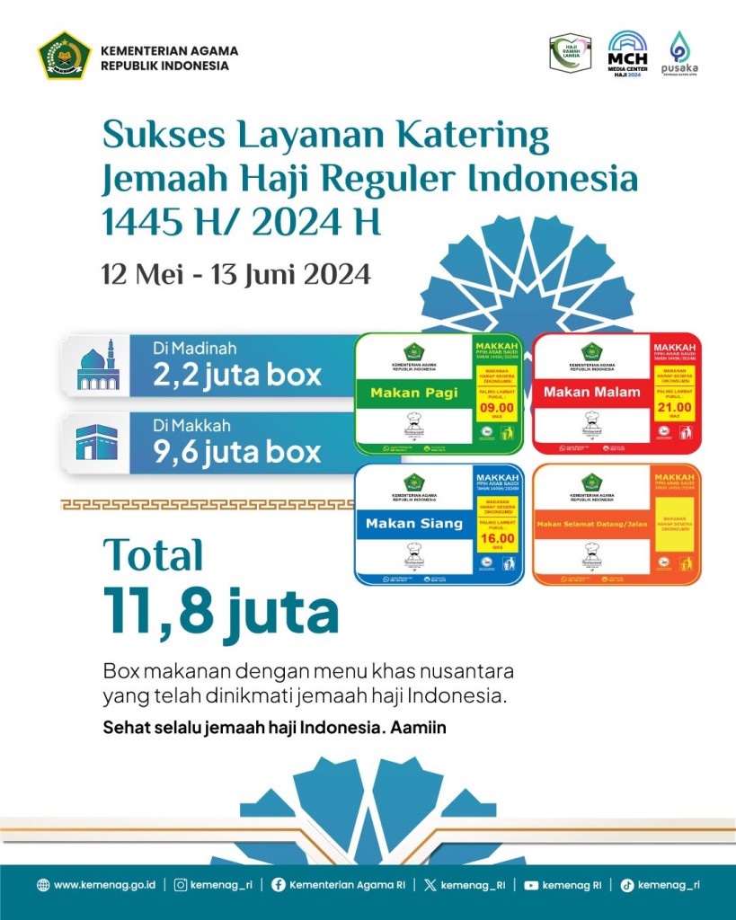“Jadi total sudah 11,8 juta boks makanan dengan menu khas nusantara yang telah dinikmati jemaah haji Indonesia di Madinah dan Makkah,” ungkap dia.