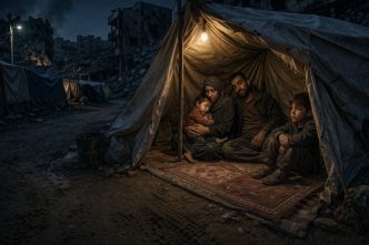 Menjelang sore, jalanan dipenuhi tenda dari kain tipis. Di dalamnya, keluarga berdesakan. Lampu seadanya menyala redup. Suara anak-anak bercampur dengan percakapan pelan orang dewasa yang berusaha tetap tenang.