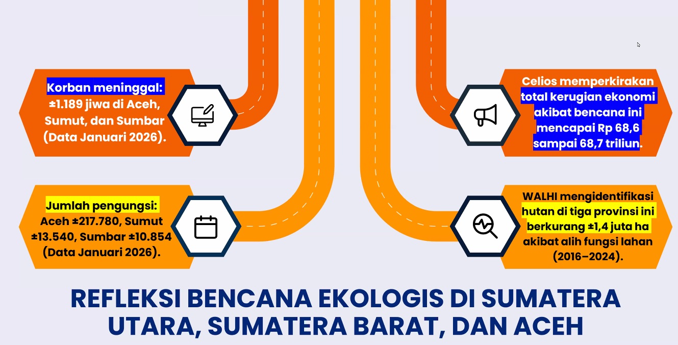 “Center of Economic and Law Studies (CELIOS) memperkirakan total kerugian ekonomi akibat bencana ini mencapai Rp68,6 hingga Rp68,7 triliun,” ujarnya.