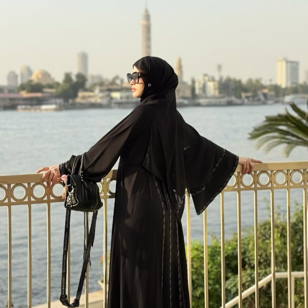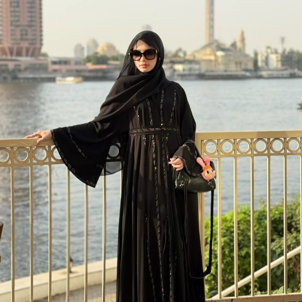 Abaya hitam Inara tampak hidup di bawah sinar matahari sore di tepi Sungai Nil — sederhana, tapi memancarkan kemewahan alami tanpa detail berlebihan.