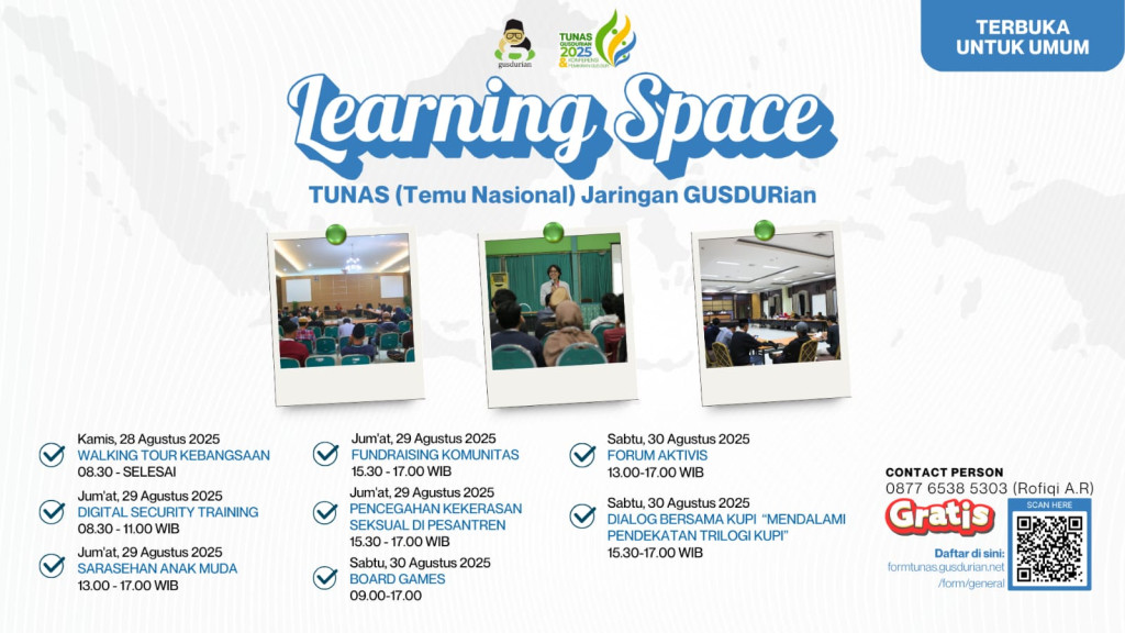 Menjawab kebutuhan tersebut, Jaringan Gusdurian menghadirkan learning space pencegahan kekerasan seksual di pesantren pada gelaran Temu Nasional (Tunas) Gusdurian 2025. Agenda ini akan berlangsung pada 29–31 Agustus 2025 di Asrama Haji Pondok Gede, Jakarta Timur.