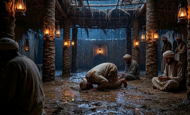 Riwayat tersebut juga mencatat peristiwa yang menyertainya. Pada malam itu turun hujan, sedangkan atap Masjid Nabawi ketika itu masih terbuat dari pelepah kurma. Air hujan menetes hingga lantai masjid menjadi basah.