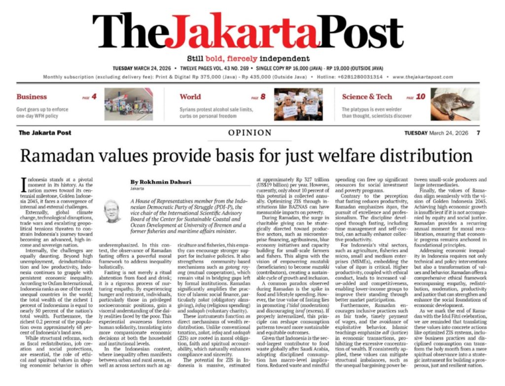Pandangan tersebut disampaikan Prof. Rokhmin dalam tulisannya yang dimuat dalam koran berbahasa Inggris, The Jakarta Post, edisi Selasa, 24 Maret 2026. Artikel berjudul “Ramadan values provide basis for just welfare distribution” itu menyoroti bahwa Indonesia sedang menghadapi tantangan serius, baik pada tingkat global maupun domestik.
