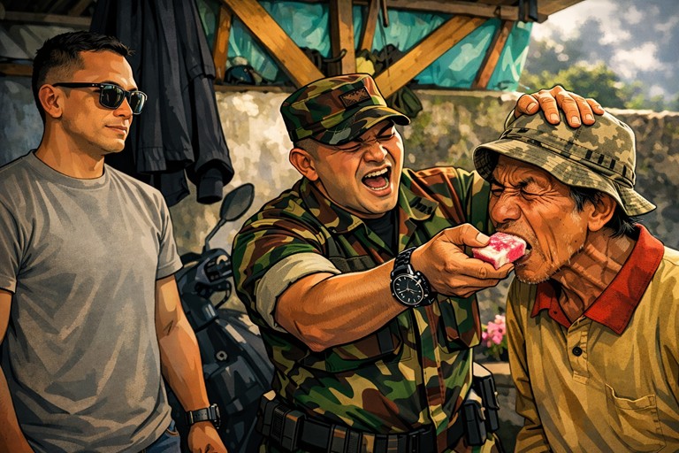 Dalam salah satu rekaman yang beredar luas, bahkan seorang aparat terlihat mengambil sepotong es gabus lalu mengarahkannya ke mulut Sudrajat. Sudrajat mengikuti arahan tersebut dengan mulut terbuka dan tubuh condong ke depan, sementara warga di sekitar hanya terdiam turut menyaksikan.
